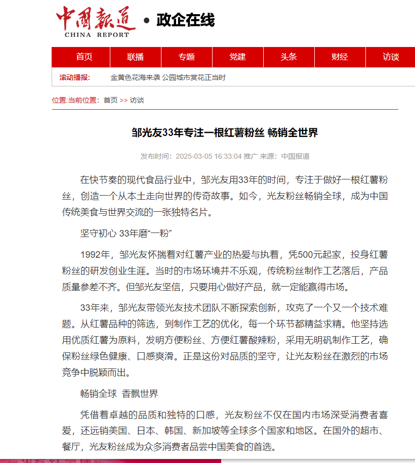 轉載中國報道網(wǎng)——鄒光友33年專(zhuān)注一根紅薯粉絲 暢銷(xiāo)全世界