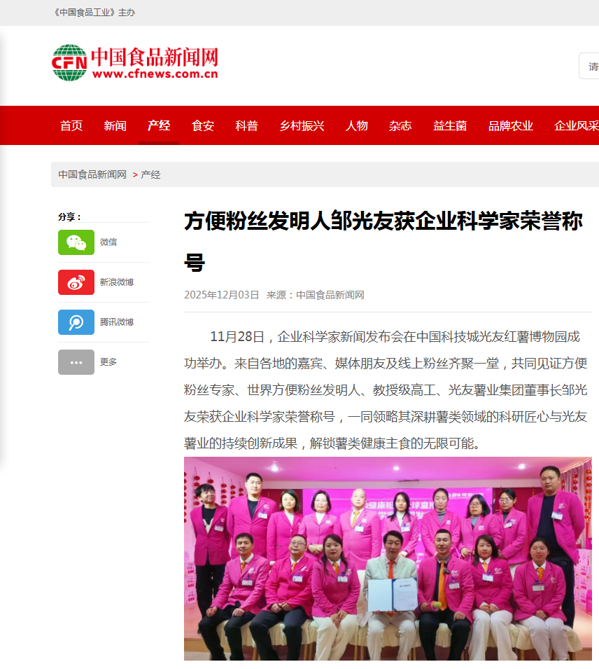 轉載中國食品新聞網(wǎng)-方便粉絲發(fā)明人鄒光友獲《企業(yè)科學(xué)家》榮譽(yù)稱(chēng)號